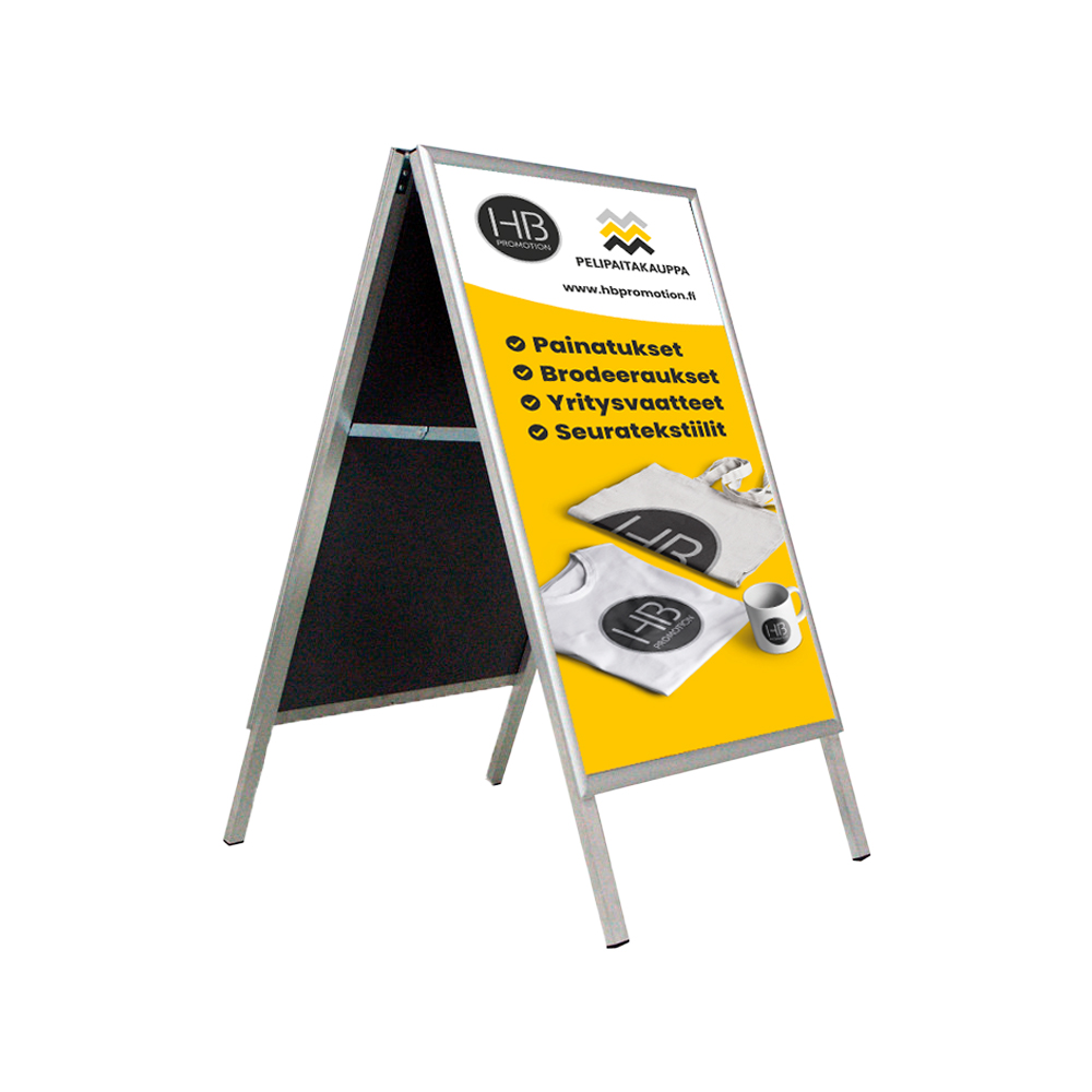 Kevyt A-teline on kaksipuolinen ja siihen saa esille A2 kokoiset ja sitä pienemmät mainostulosteet.