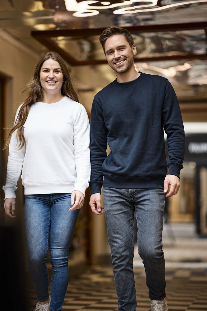 Pyöreäkaula-aukkoinen collegepaita, jossa harjattu pehmeä sisäpuoli. 2x2-ribbineulos kaula-aukossa, hihansuissa ja helmassa. Saumurilla ommellut koristetikkaukset sävy sävyyn paidan kanssa.