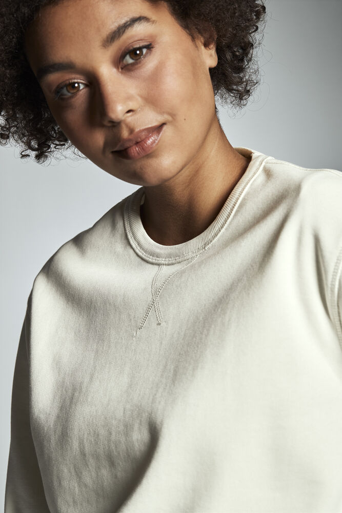 Pyöreäkaula-aukkoinen collegepaita, jossa harjattu pehmeä sisäpuoli. Kavennettu unisex-malli. 2x2-ribbineulos kaula-aukossa, hihansuissa ja helmassa. Saumurilla ommellut koristetikkaukset sävy sävyyn paidan kanssa.