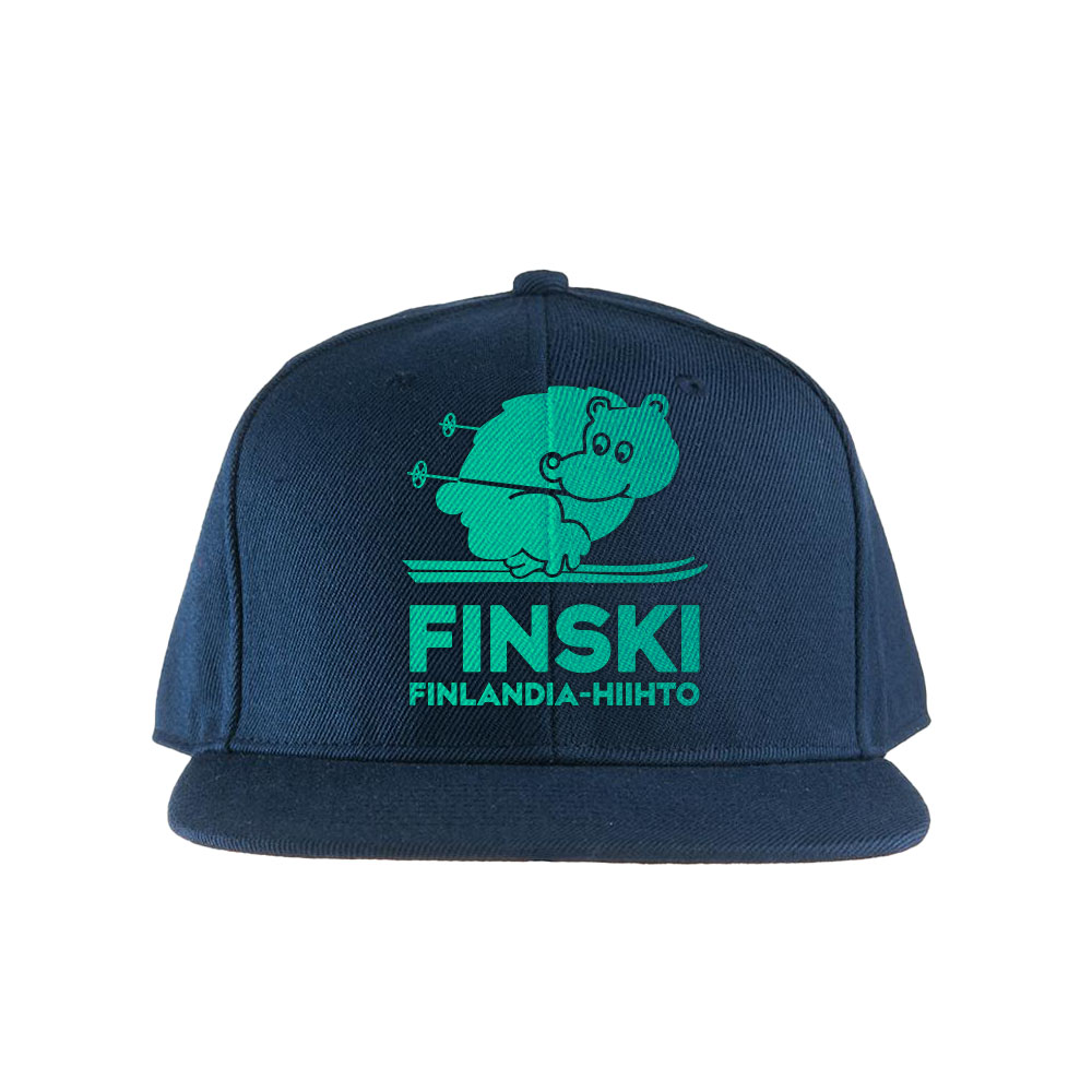 Tummansininen lakki on varustettu brodeeratulla Finski-logolla, joka tuo sporttisen ja arvokkaan ilmeen.