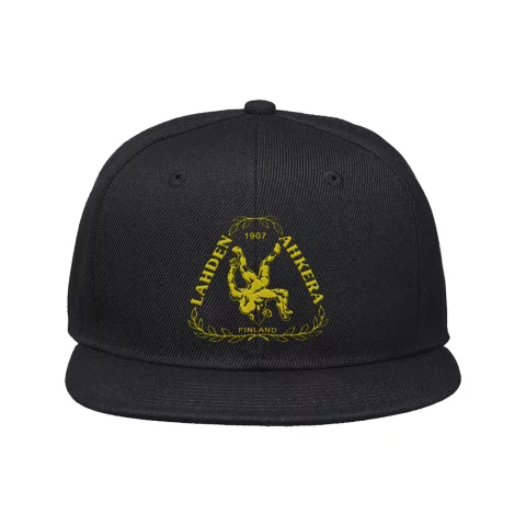 Lahden Ahkeran Snapback lippis brodeeratulla keltaisella logolla.