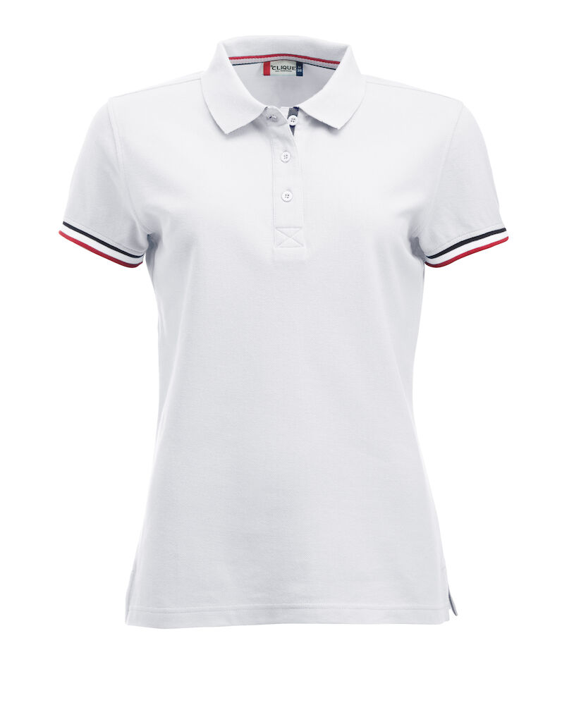 Trendikäs naisten pikeepaita, jossa kontrastiraidat kauluksen alapuolella, niskanauha ja sivuhalkiot.